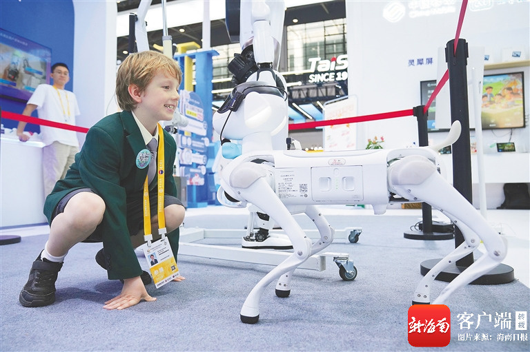 在消博会现场,一名外籍小朋友与AI机器狗开心互动。海南日报全媒体记者 王程龙 摄